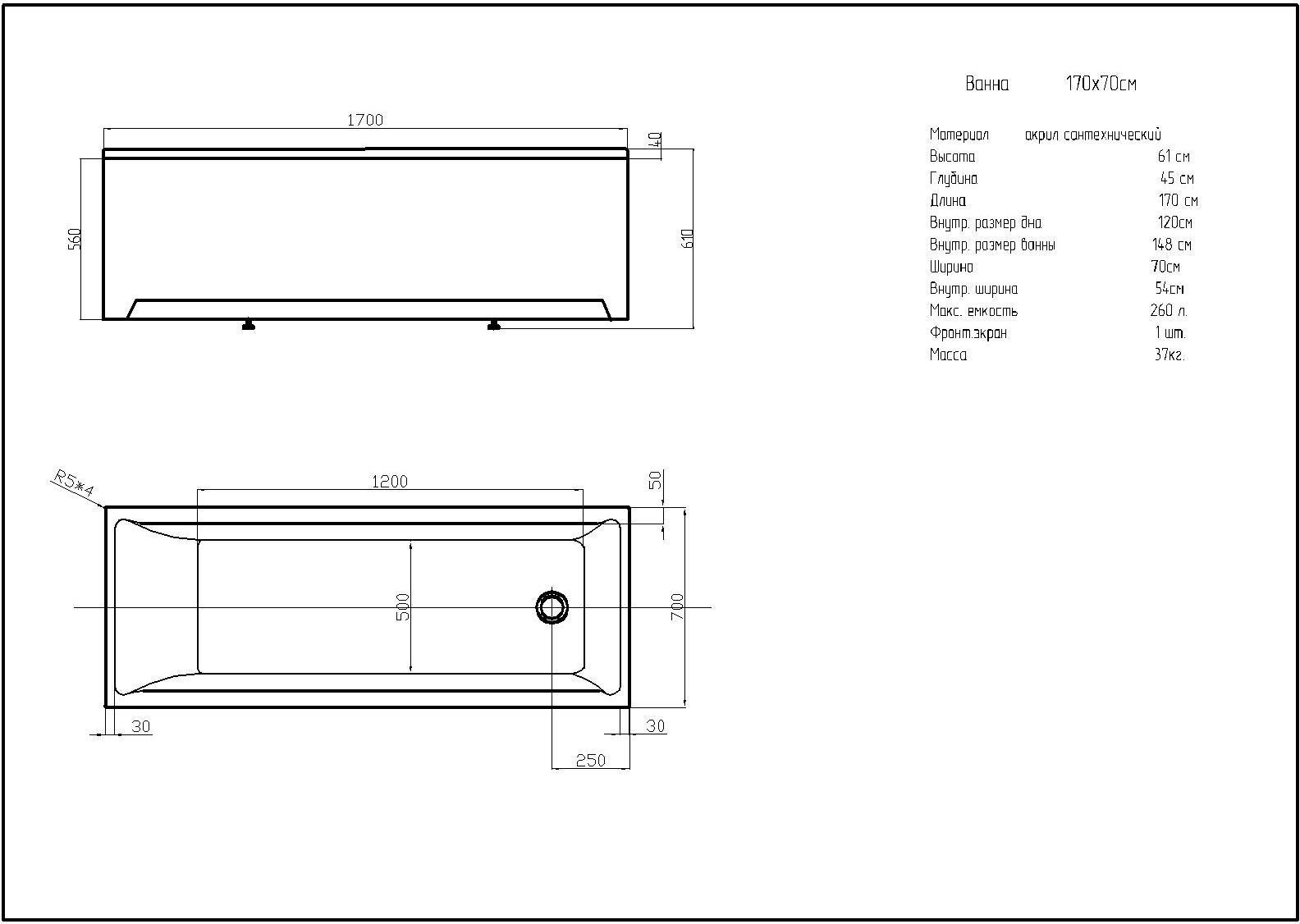 Ванна акриловая прямоугольная Aquatek Лайма 170х70 см, цвет белый, каркас и фронтальная панель приобретаются отдельно.