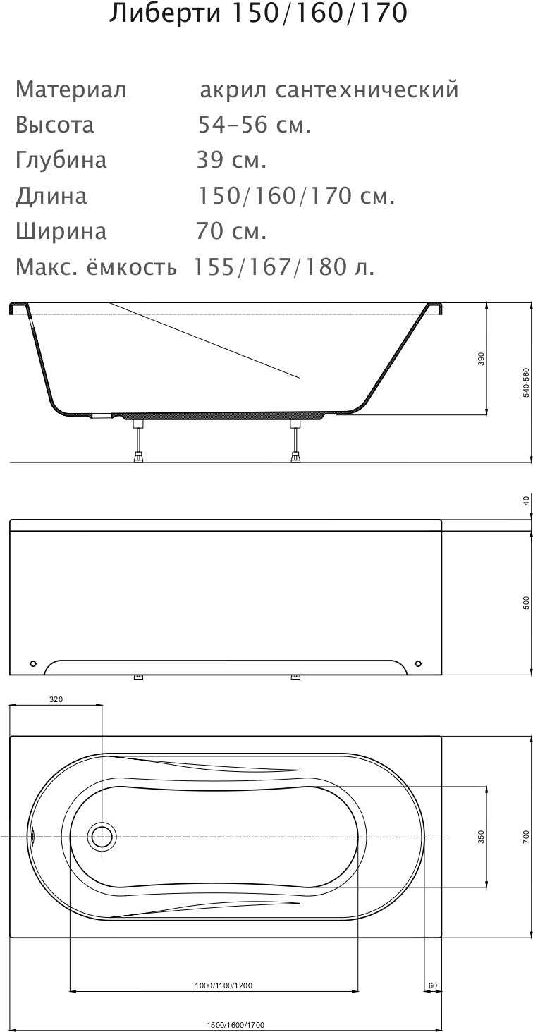 Ванна акриловая Aquatek Lifestyle Либерти 170x70 см, цвет белый, каркас, ножки и фронтальная панель приобретаются отдельно.