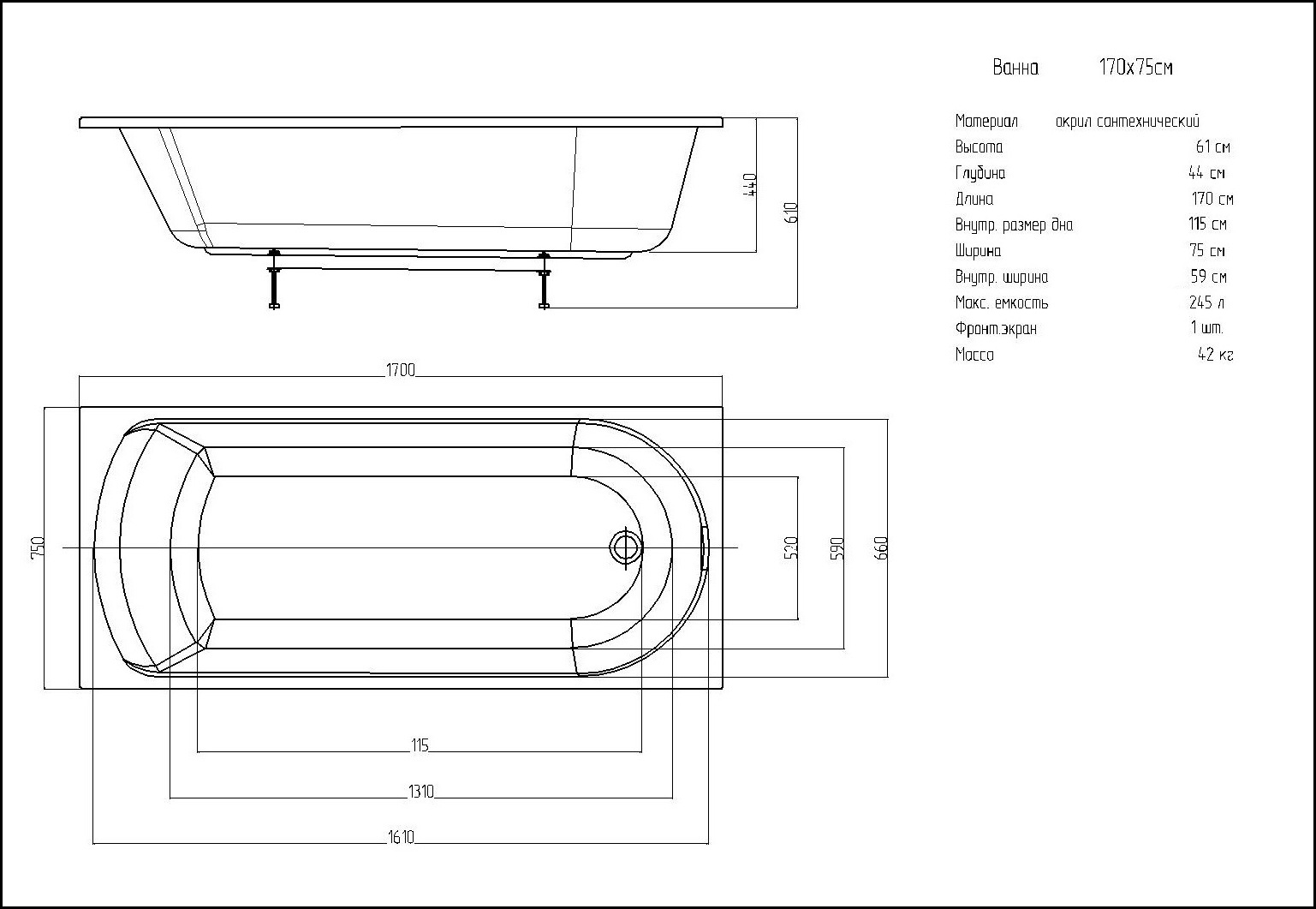Ванна акриловая Aquatek Ника 170х75 см NIK170-0000001