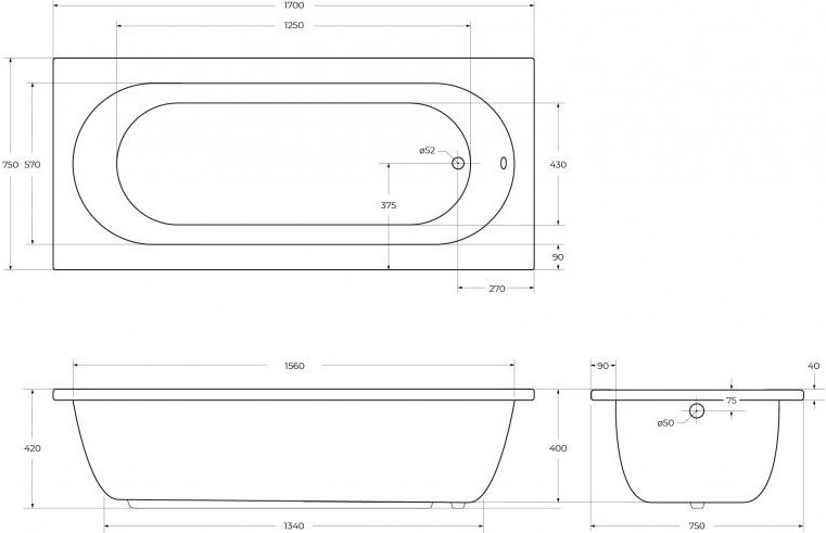 Ванна акриловая Cezares Piave 1700x750x420 мм, цвет белый.