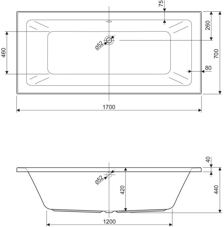 Ванна акриловая Cezares Plane 1700x700x450 мм
