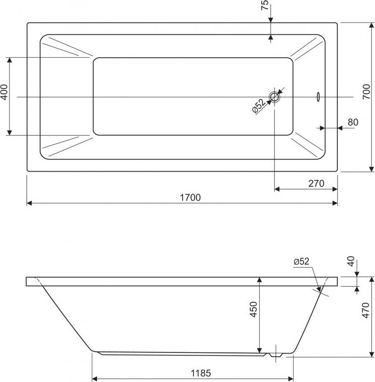 Ванна акриловая Cezares Plane Solo 1700x700x470 мм, цвет белый.