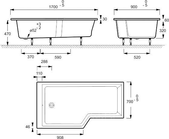Ванна акриловая Jacob Delafon Bain Douche Neo 170х90 см L E6D002L-00, цвет- белый. В комплекте ножки.