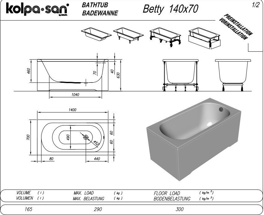 Характеристики ванна Kolpa-San (BETTY 140x70)