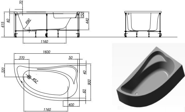 Ванна акриловая Calando 160x90 см, с каркасом, панель приобретается отдельно.