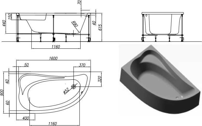 Ванна акриловая Calando 160x90 см, с каркасом, панель приобретается отдельно.