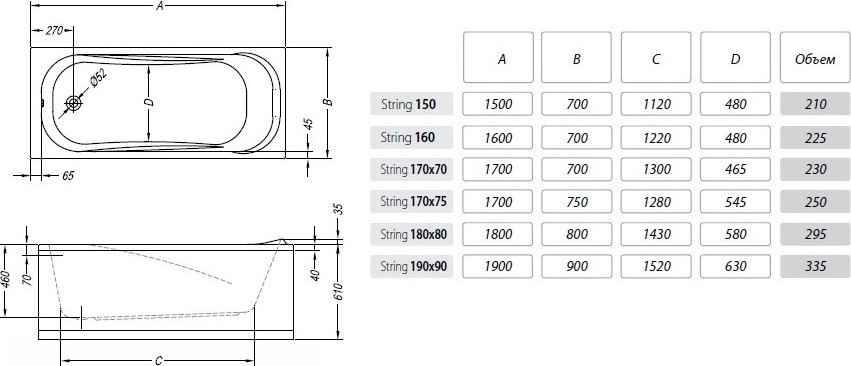 Ванна акриловая String 190x90 см, с каркасом и сливом-переливом, панели приобретаются отдельно.