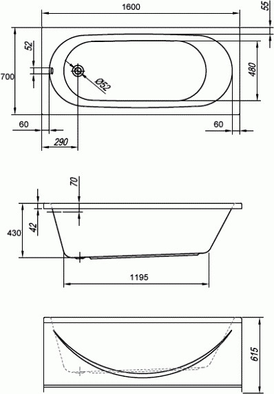 Ванна акриловая Tamia 160x70 см, каркас, ножки, слив-перелив и панели приобретаются отдельно.