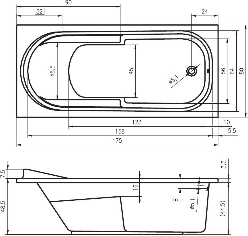 Ванна акриловая COLUMBIA 1750x800 мм, цвет белый.