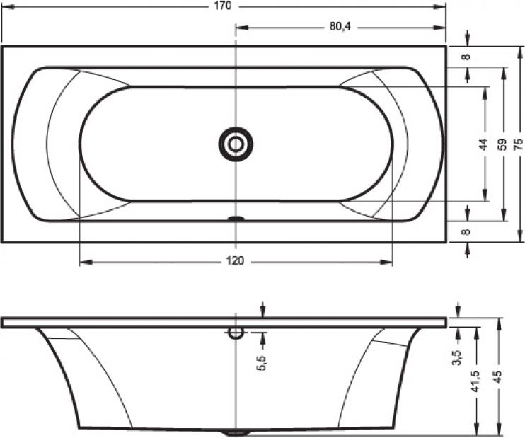 Ванна акриловая LIMA 1700x750 мм, толщина бортика 35 мм, цвет белый.