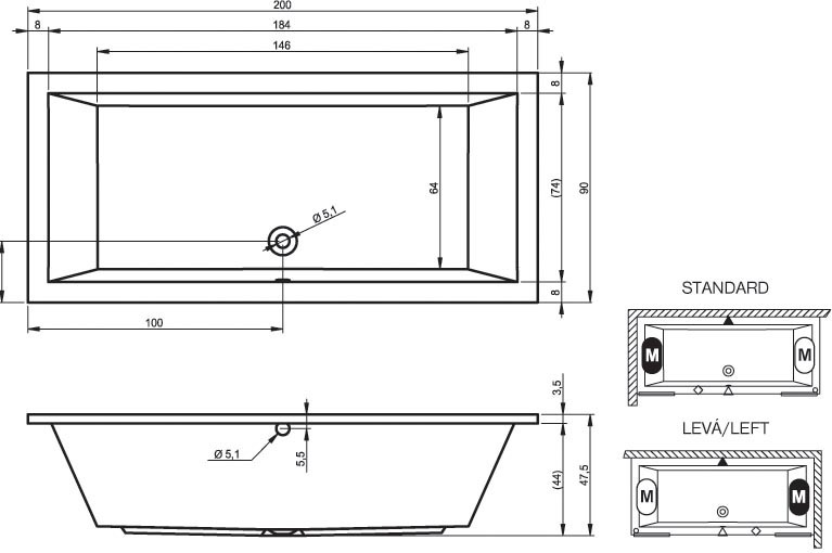 Ванна акриловая LUSSO 2000x900 мм, толщина бортика 35 мм, цвет белый.