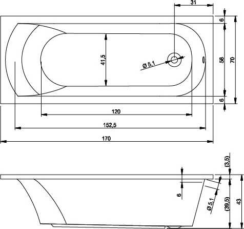 Ванна акриловая MIAMI 1700x700 мм, цвет белый.