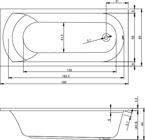 Ванна акриловая MIAMI 1800x800 мм, цвет белый.