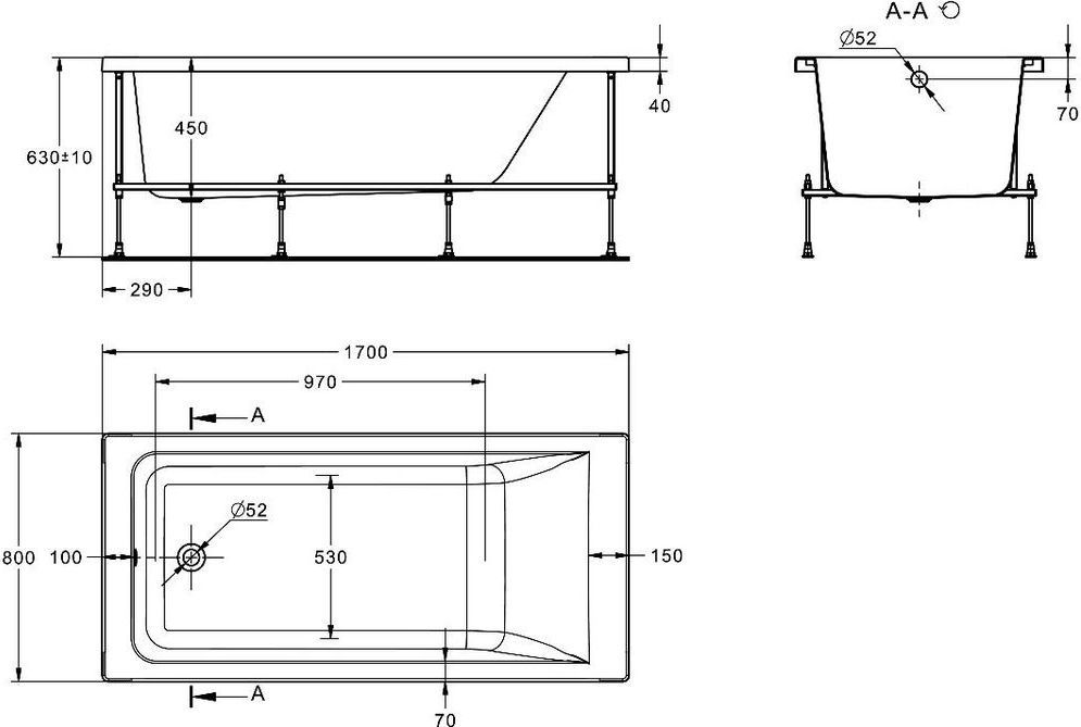 Ванна акриловая Roca Easy, размер 1700х800х630 мм, монтажный комплект и панели приобретаются отдельно.