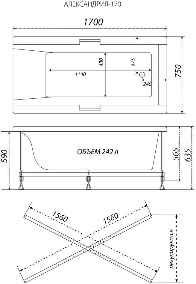 Ванна акриловая Тритон Алекса с каркасом, размер 1700х750 мм, сифон приобретаются отдельно, цвет белый.