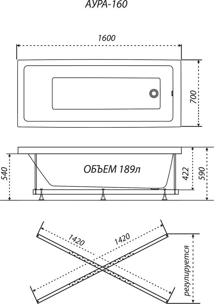 Ванна акриловая Тритон Аура с каркасом, размер 1600х700 мм, сифон приобретаются отдельно, цвет белый.
