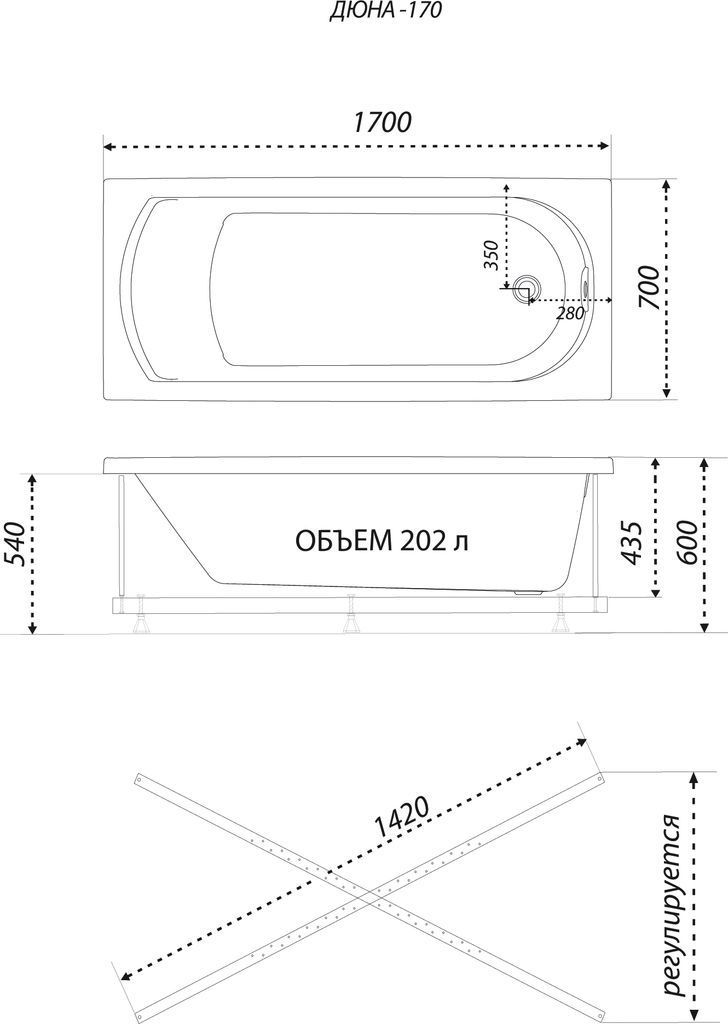 Ванна акриловая Тритон Дюна с каркасом, размер 1700х700х600 мм, цвет белый. Панель приобретается отдельно.