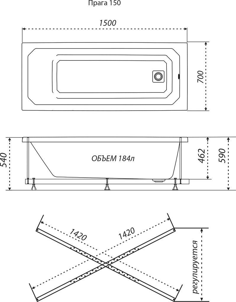 Ванна акриловая Тритон Прага с каркасом, размер 1500х750 мм, сифон приобретаются отдельно, цвет белый.