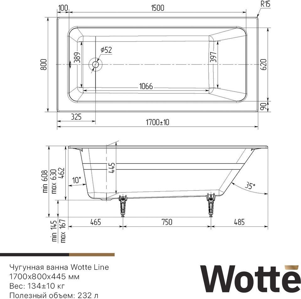 Ванна чугунная Wotte Line, размер 1700х800х630 мм. Цвет белый. Ножки и сифон приобретаются отдельно.