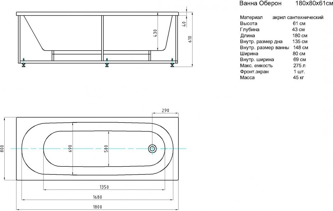 - Внутр. размер ванны 168 см