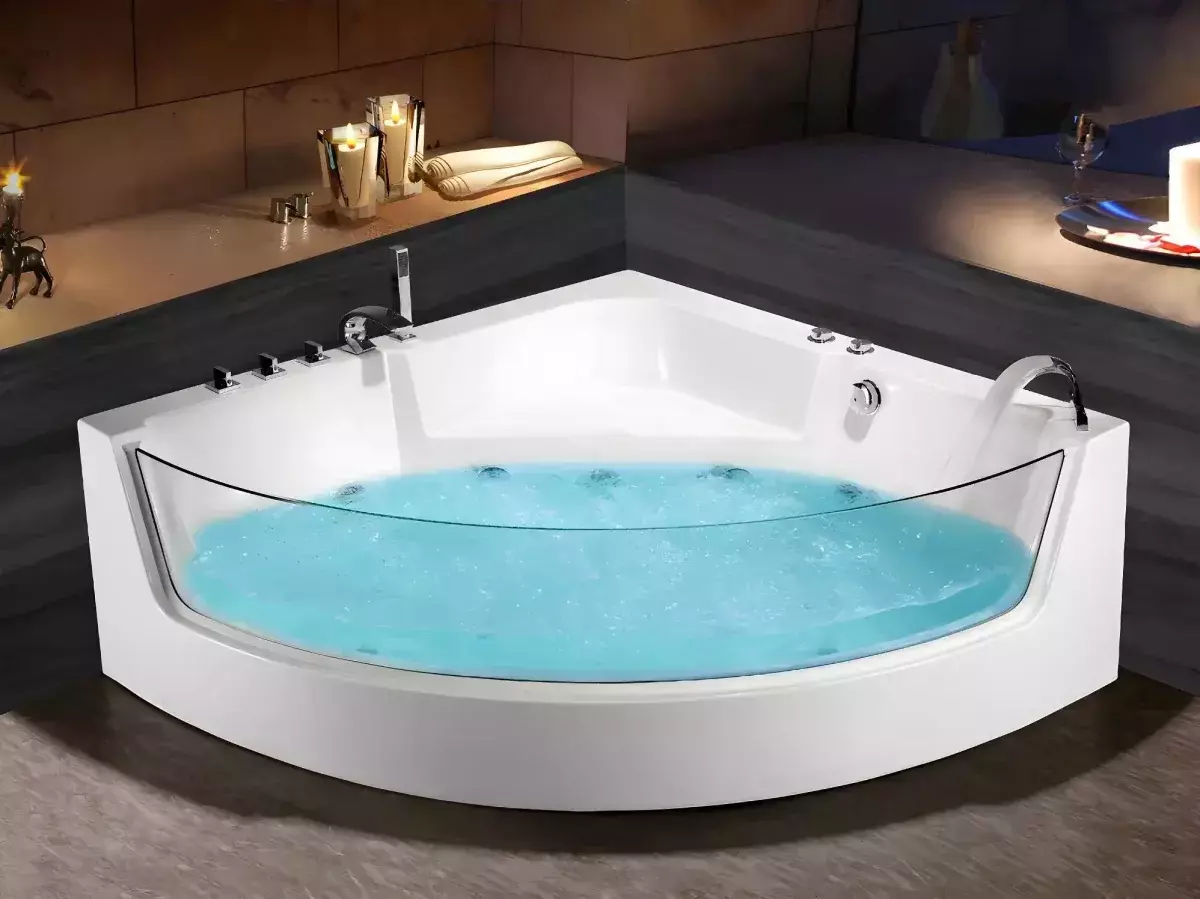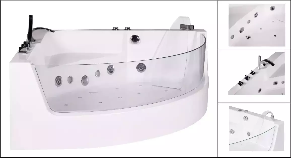 Теплые волны гидромассажа бурлят наполняя ощущением тропического пляжа. За счет большого стеклянного экрана без рамки ванна выглядит изящно и современно.
