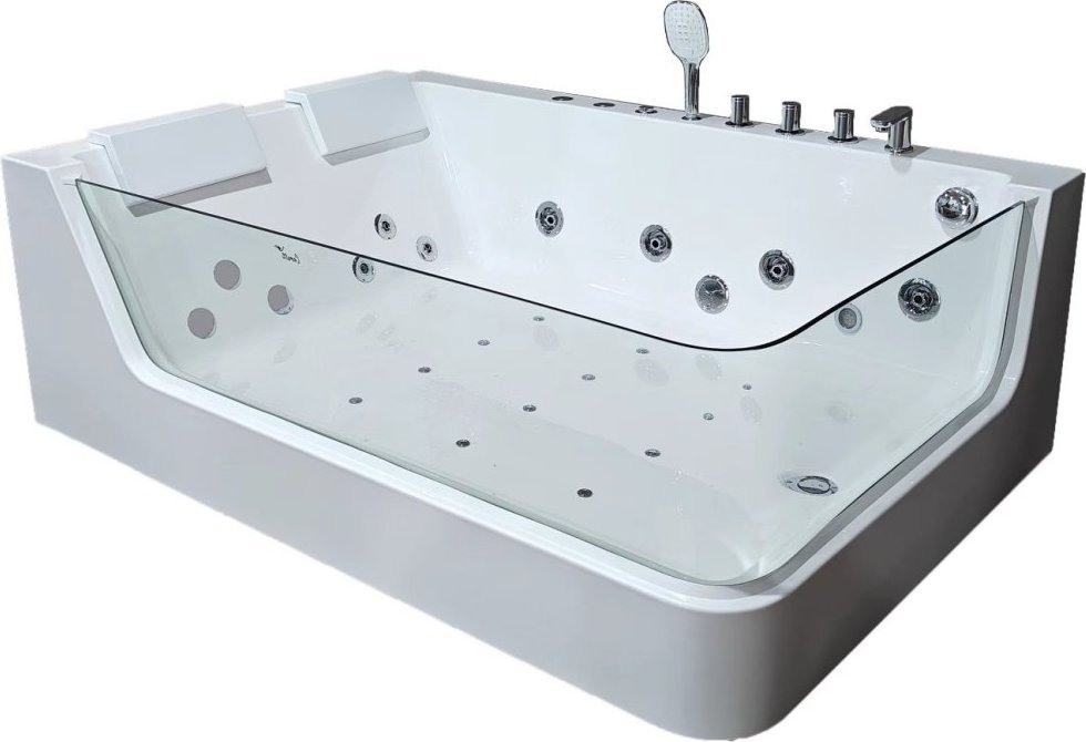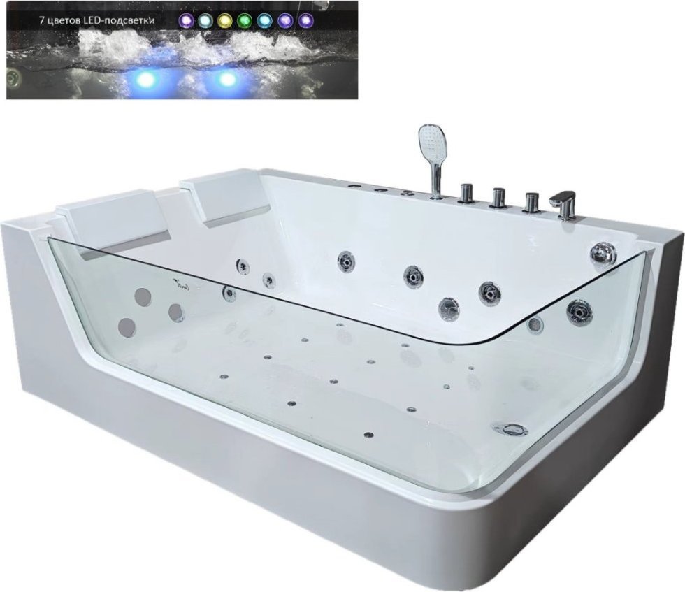 Просторная двухместная акриловая ванна с гидромассажем и двумя прозрачными стенками поражает соей красотой и размерами. Великолепное Спа у Вас дома.