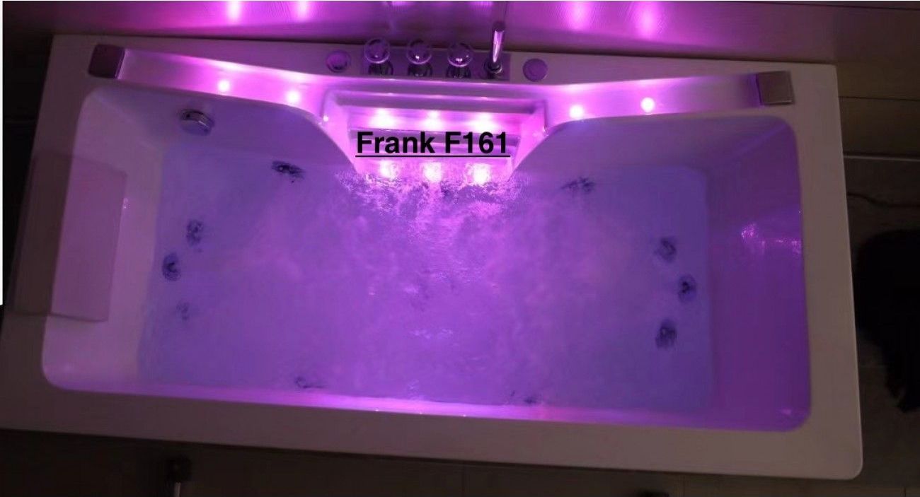 Все гидромассажные ванны Frank поставляются в максимальной комплектации и имеют множества функций. Ванна с гидромассажем Frank F161 пристенная, прямоугольная с аэромассажем,гидромассажем,турбомассажем. Также ванна снабжена системой дезинфекции. Форсунки расположены в ванне с учётом эргономики тела и способствуют максимальному охвату поверхности тела при работе аэро- и гидромассажных двигателей. Вся ванна сделана из литьевого акрила. Передний и боковые экраны сделаны единой конструкцией с ванной. Стоит система слива остатков воды из форсунков. Лицевая стенка изготовлена из 10мм закалённого стекла. Ванна имеет 2 каскадных налива воды с точечной подсветкой 5 цветов.