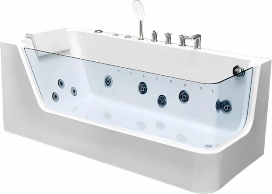 Все гидромассажные ванны Frank поставляются в максимальной комплектации и имеют множества функций. Ванна с гидромассажем Frank F101R правая, с аэромассажем, гидромассажем, турбомассажем, водопадом. В боковой стенке установлен звёздный дождь-хромотерапия. Также ванна снабжена системой дезинфекции. Форсунки расположены в ванне с учётом эргономики тела и способствуют максимальному охвату поверхности тела при работе аэро- и гидромассажных двигателей. Используется высокопрочное стекло 10 мм., с антибактериальным покрытием без металлической окантовки, что придаёт ванне современный дизайн. Стоит система слива остатков воды из форсунков.. Уникальный дизайн ванны с прозрачными стеклянными боковыми стенками.