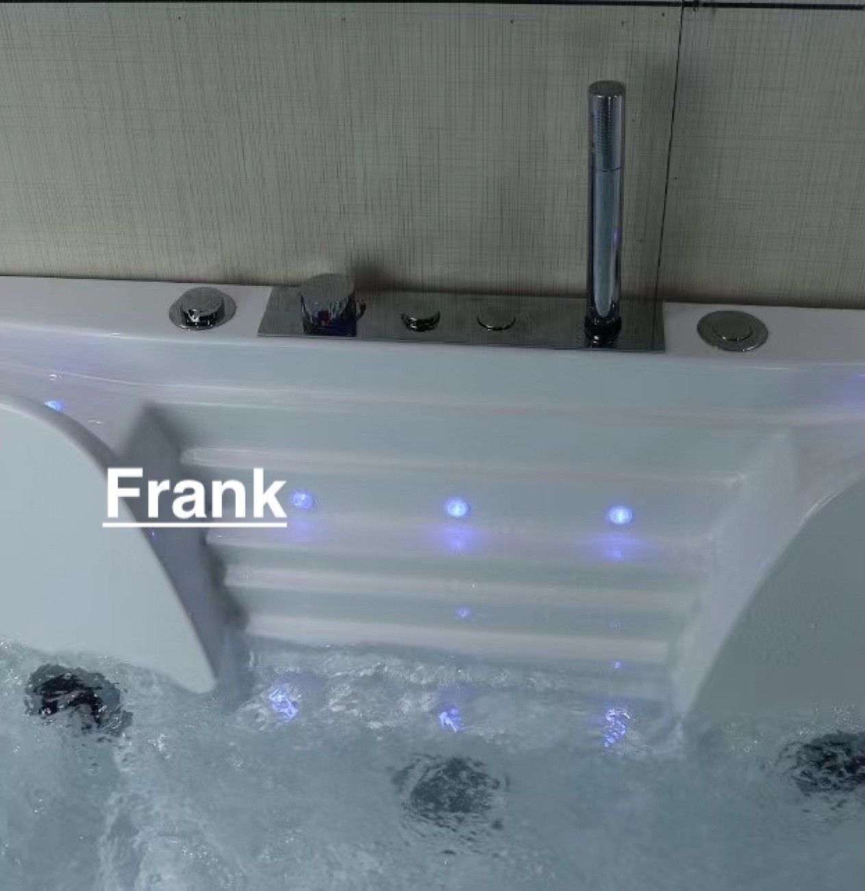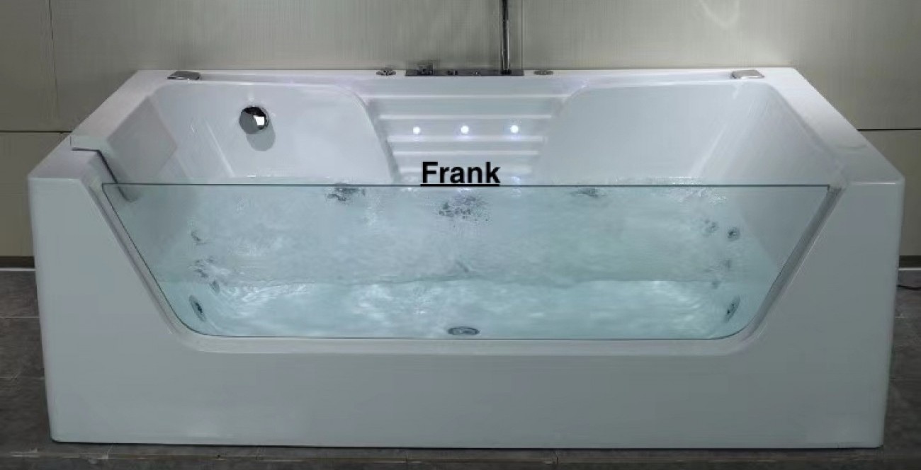 - Все гидромассажные ванны Frank поставляются в максимальной комплектации и имеют множества функций. Ванна с гидромассажем Frank F150 пристенная, прямоугольная с аэромассажем, гидромассажем, турбомассажем. Также ванна снабжена системой дезинфекции. Форсунки расположены в ванне с учётом эргономики тела и способствуют максимальному охвату поверхности тела при работе аэро- и гидромассажных двигателей. Вся ванна сделана из литьевого акрила. Передний и боковые экраны сделаны единой конструкцией с ванной. Стоит система слива остатков воды из форсунков. Лицевая стенка изготовлена из 10 мм закалённого стекла. Ванна имеет 2 каскадных налива воды с точечной подсветкой 5 цветов.