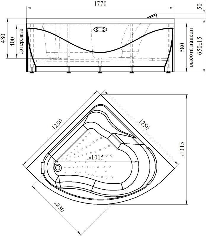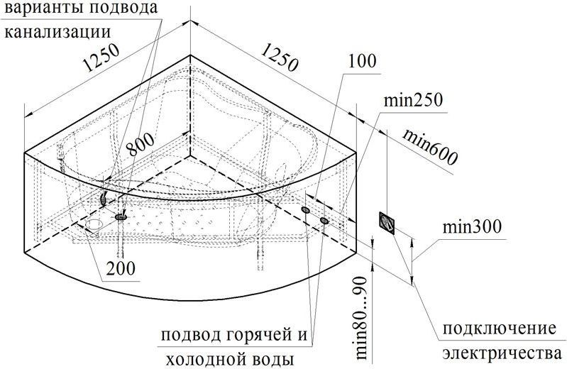 Равносторонняя угловая модель имеет внешние компактные габариты 1250х1250х650 мм с увеличенным внутренним пространством 1015х830 мм.