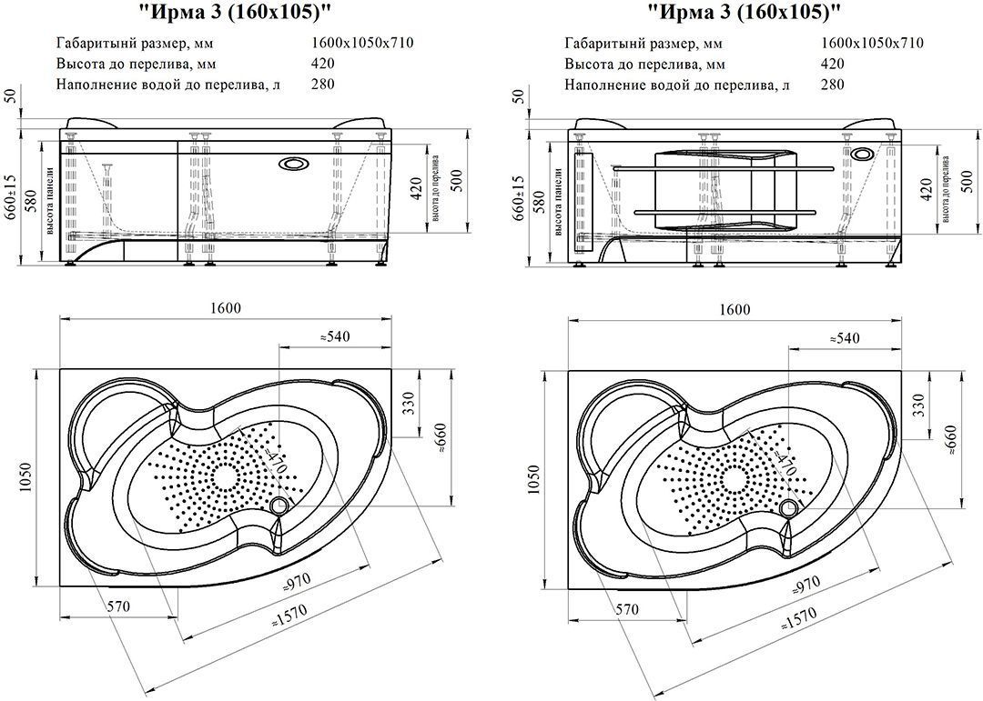 Ванна «Ирма» 160х105 формой и функционалом повторяет модель «Ирма» 169х110, отличается лишь более компактными размерами, что позволяет установить ванну даже в малогабаритном помещении.