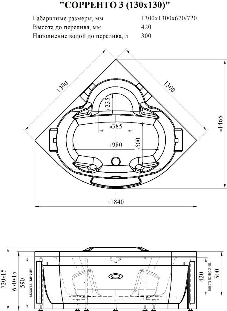 Угловая симметричная ванна «Сорренто» 130х130 отличается более компактными размерами и подходит для небольшой ванной комнаты. Ванна устанавливается в угол, имеет две одинаковые стороны и изящно скругленную третью, за счет чего отлично вписывается в интерьер. Несмотря на сокращенные габариты, купель обладает глубиной 500 мм и рассчитана на объем 300 л.