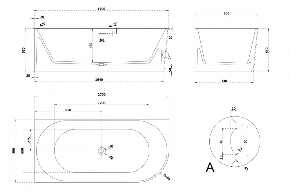 Ванна каменная Abber Stein 170x80 см AS9651 L, белый матовый