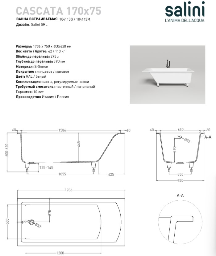 Ванна каменная Salini Cascata 170x75 см 104113G (S-Sense) глянцевая