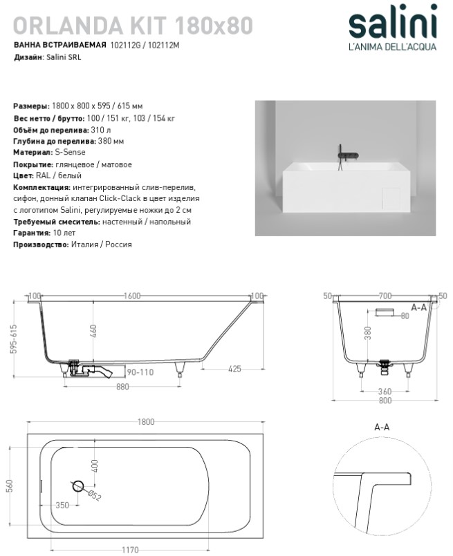 Описание ванна Salini 102112M