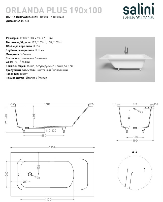 Лишние части корпуса можно обрезать, исходя из особенностей помещения, сделав ванну именно такой, какой хотите видеть её вы. Эстетичная прямоугольная чаша с закруглёнными углами выполнена в традиционном дизайне - просто и элегантно. Это одна из наиболее доступных и практичных ванн из литого камня от Salini. Обращаем внимание, что тёмные цвета изделий из материала S-Sense доступны только в глянцевом исполнении.