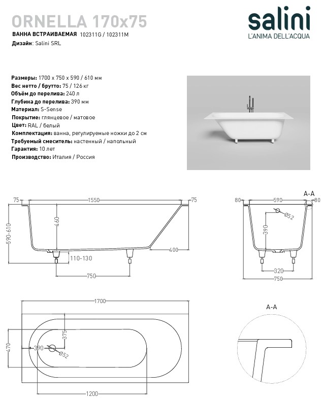 Ванна каменная Salini Ornella 170x75 см 102311G (S-Sense) глянцевая