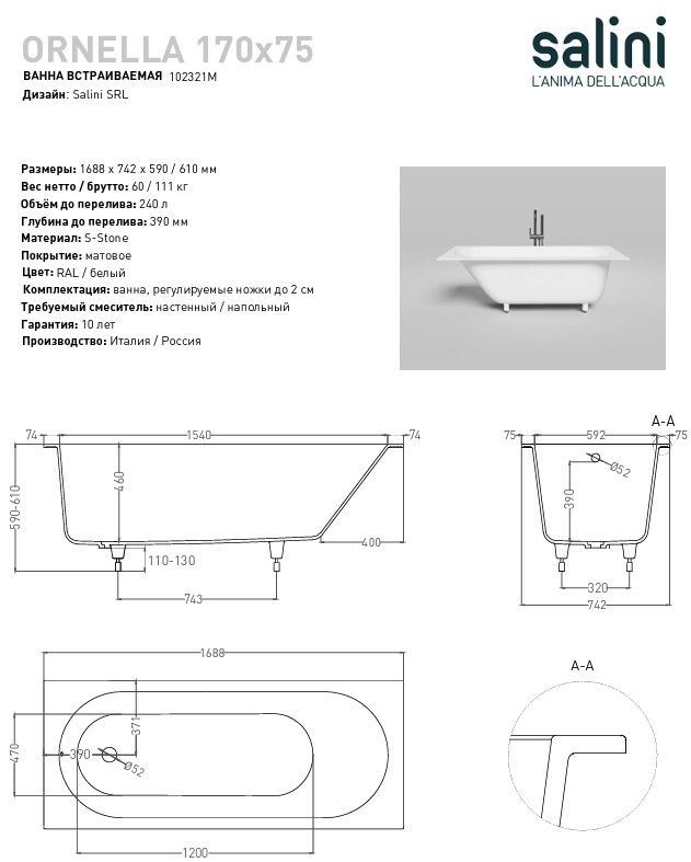 Ванна каменная Salini Ornella 169x75 см 102321M (S-Stone) матовая