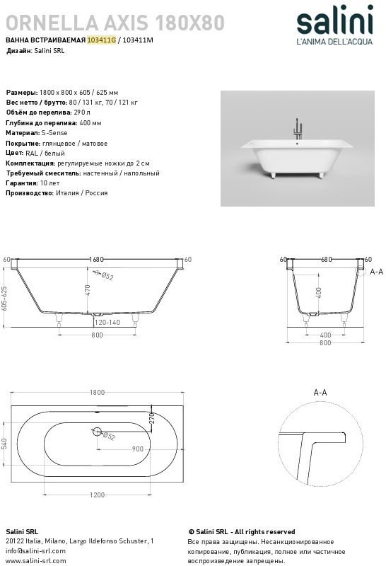 Описание ванна Salini 103411G