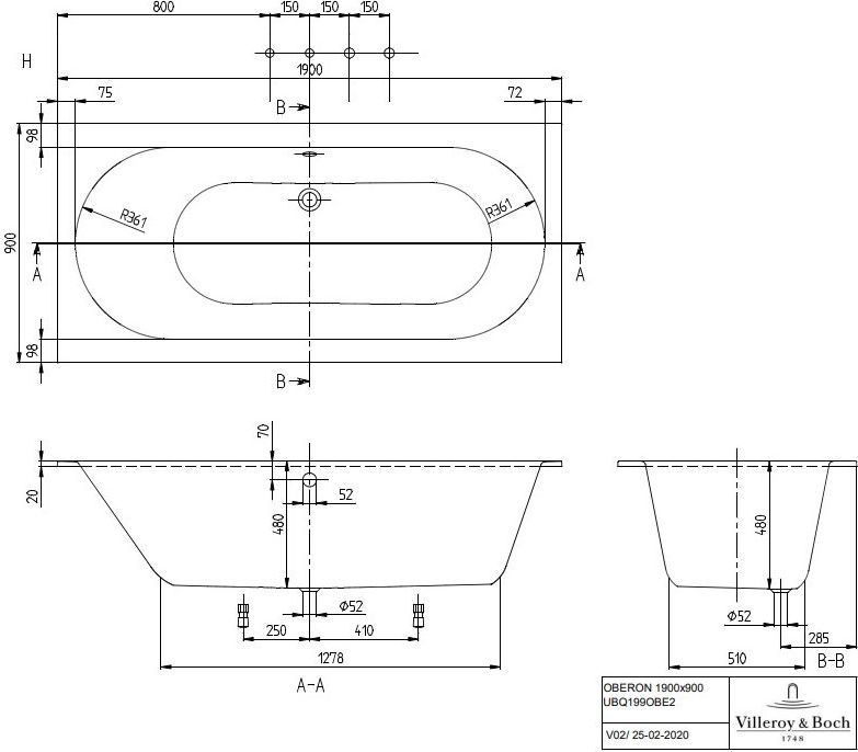 Ванна квариловая Villeroy&Boch Oberon Duo UBQ199OBE2V-01, размер 1900х900х505 мм, ножки в комплекте, цвет белый.