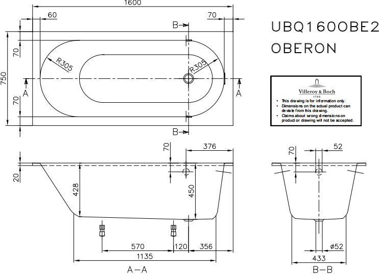 Ванна квариловая Villeroy&Boch Oberon Solo UBQ160OBE2V-01, размер 1600х750х475 мм, ножки в комплекте, цвет белый.