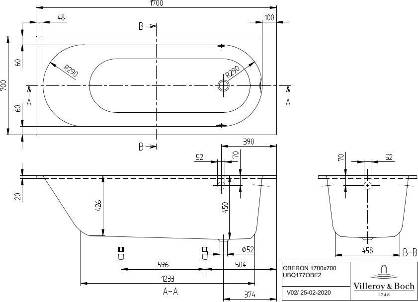 Ванна квариловая Villeroy&Boch Oberon Solo UBQ177OBE2V-01, размер 1700х700х475 мм, ножки в комплекте, цвет белый.