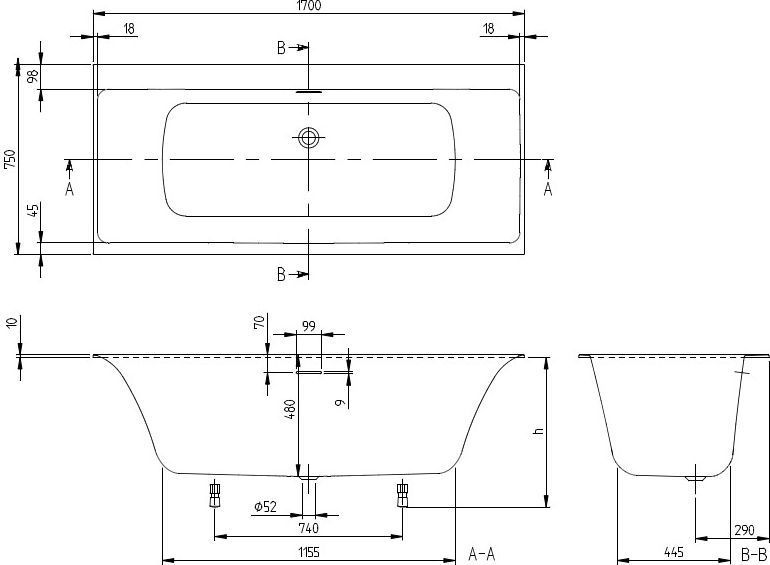 Ванна квариловая Villeroy&Boch Subway 3.0 UBQ170SBW2DV-01, размер 1700х750х480 мм, ножки и сифон в комплекте, цвет белый.