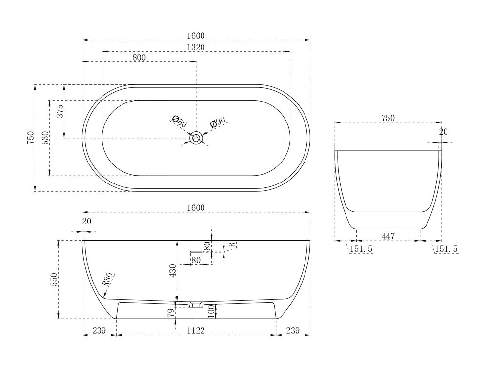 Ванна отдельностоящая Abber Stein 160x75 см AS9613-1.6