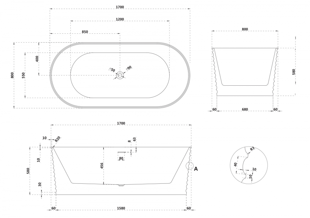 Ванна отдельностоящая Abber Stein 170x80 см AS9650, белый матовый
