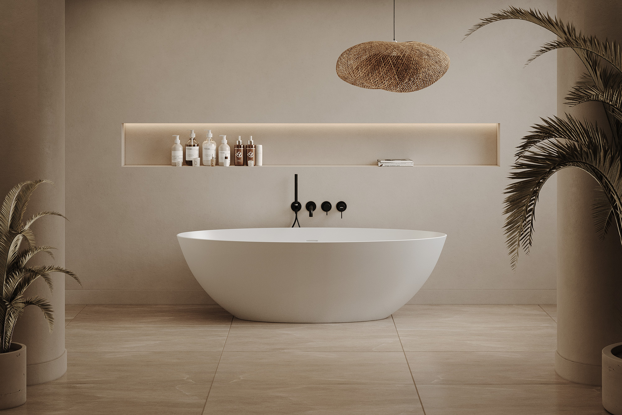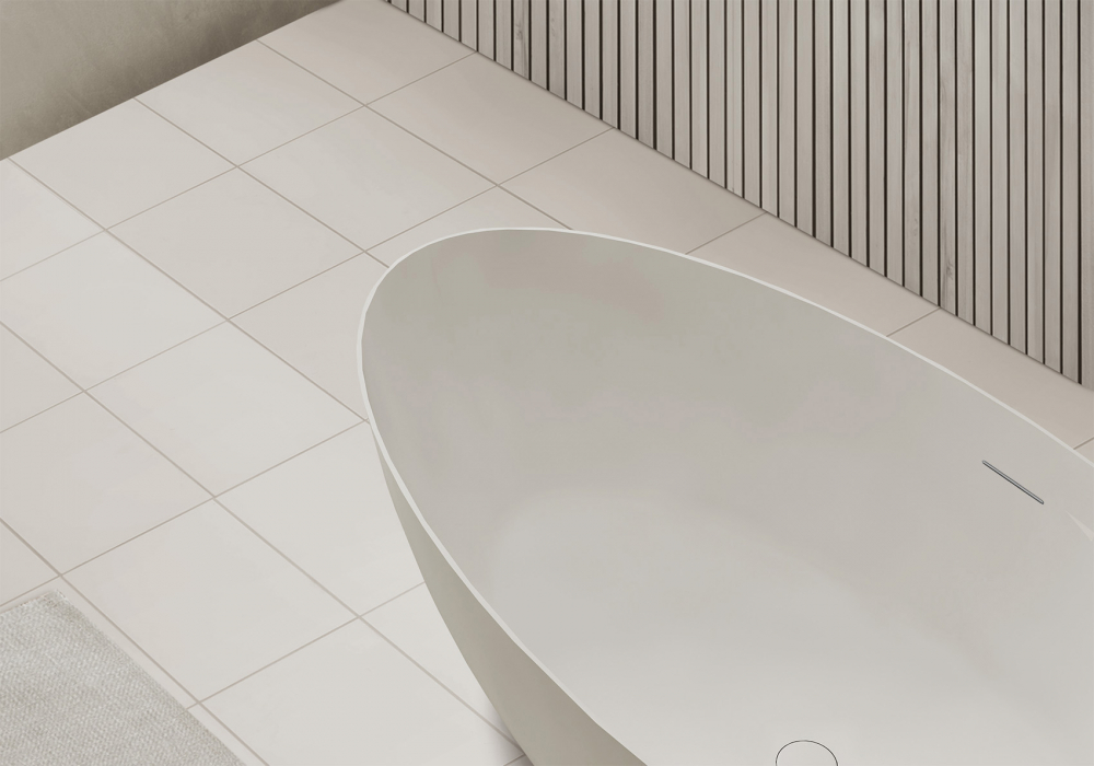 Ванна отдельностоящая Abber Stein 180x85 см AS9625-1.8 из искусственного камня, слив-перелив в комплекте, цвет - белый матовый.