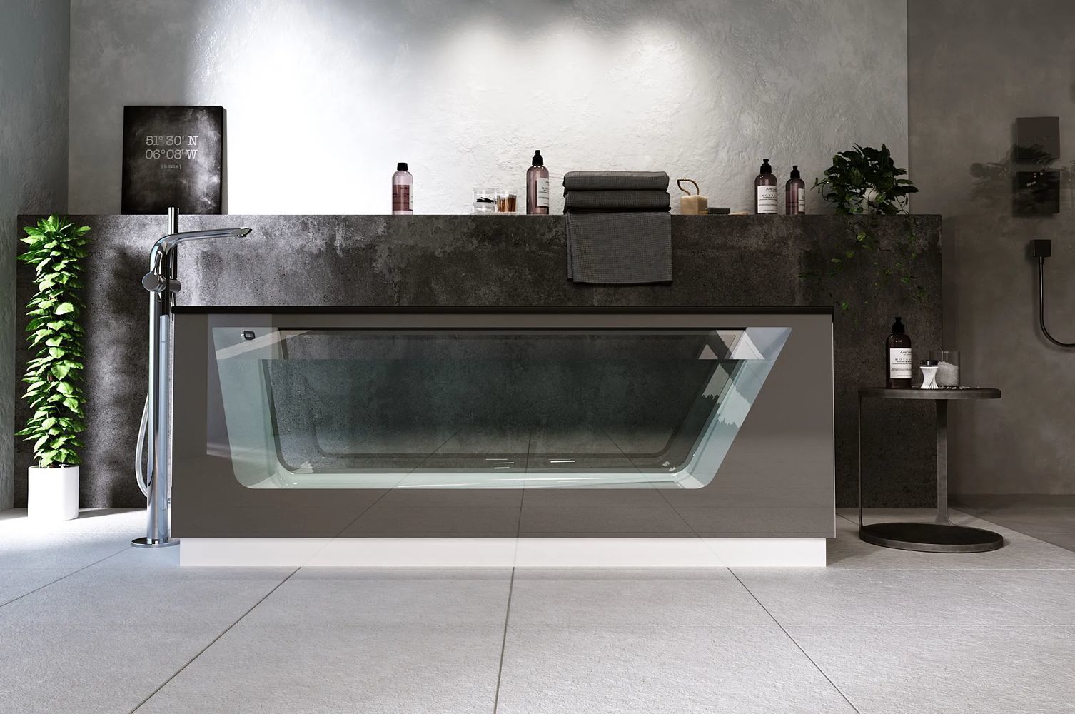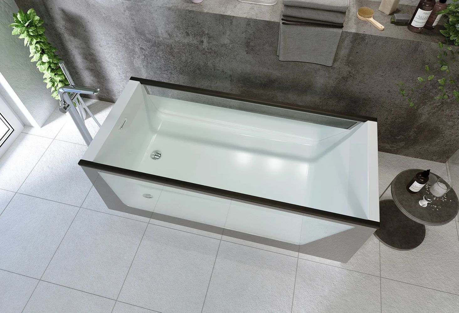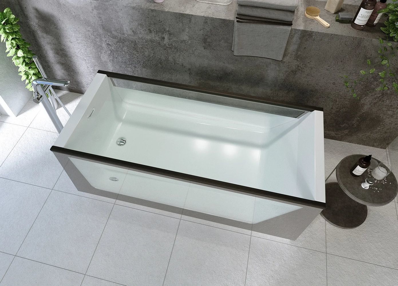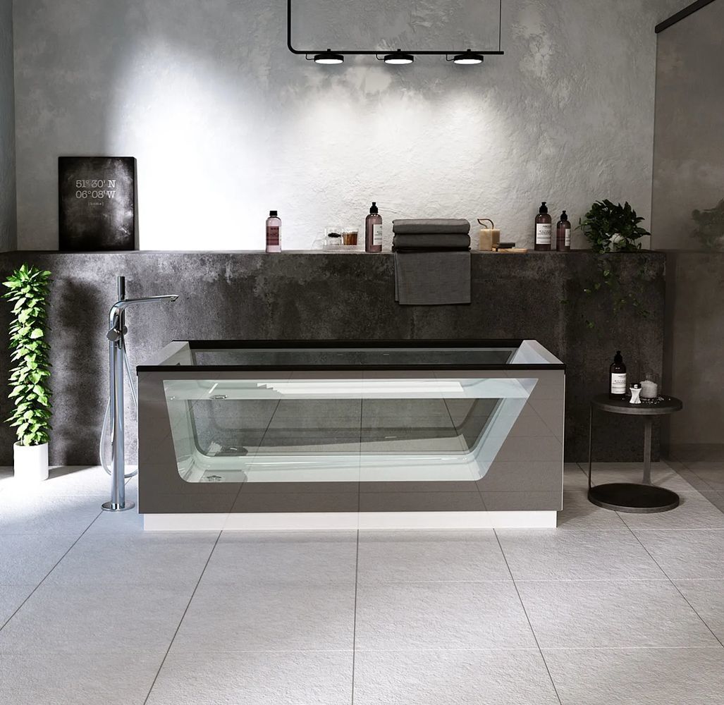 Лаконичная ванна, которая выглядит особенно стильно и привлекательно благодаря стеклянной стенке. Такое решение не только делает ее дизайн более запоминающимся и оригинальным, но и полностью избавляет внешний облик ванны от громоздкости. При этом стоит отметить и функциональность ванны при всей внешней красоте и эстетике она превосходно подходит для активного ежедневного использования.