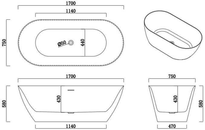 Ванна отдельностоящая AN Onda, размер 1700x750x580 мм, цвет белый.