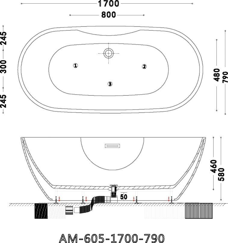Ванна отдельностоящая Art&Max 170x79 см AM-605-1700-790, слив-перелив, донный клапан, гидрозатвор и каркас в комплекте, цвет белый.