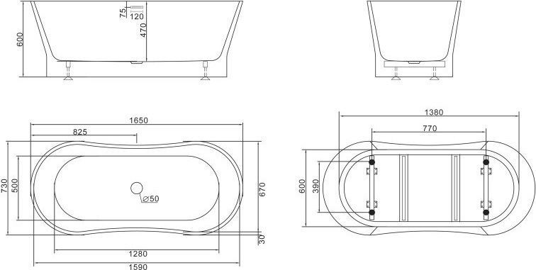 Ванна отдельностоящая BelBagno BB406-1650-730, размер: 1650х730х600 мм, в комплекте со сливом-переливом цвета хром.